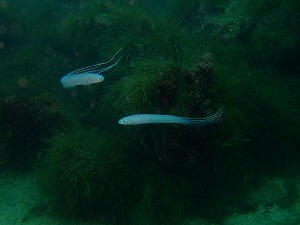 ダメかと思った天気予報でしたが、風はおさまりました。途中で荒れることもなく、ビーチもボートも出ましたよ。しかし・・・ボートではとても潮が早く、こいのぼり状態!!ご希望の赤根には入れませんでした。午後にはその赤根のブイがなくなる事件が!!潮が早いのでブイが浮かんでこないという激流だったようです。午前も午後も安全に違うポイントへいきました。鵜島イサキの子供の群れがすごい数でびっくりしました。クマノミもすくすく育っています。