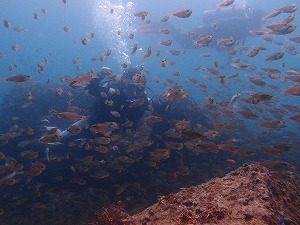 今日もいい感じっす。海も穏やかですし、水温も暖かいですし、海もキレイです!カメちゃんは今日も2匹健在!!ガイドロープ横のスージーも奥のなおみちゃんも元気、元気。ゆっくりお昼ね中やら、掃除中やらご飯中を目撃されても文句ひとつ言わないし・・・。ね・・。明日もよろしく!ベニカエルアンコウのペアーの一匹がおなかが大きいです。もうすぐ産卵ですね。明日にはいなくなっちゃうかなぁ??他にもベニカエルが見つかっているので毎日増えていく感じです。広いこの海でベニカエルアンコウも私達も会えるといいですね♪浅場にクロホシイシモチの群れがいっぱいです。記念撮影がどちらが主役かわかりません。そんなダイビングがやっぱり理想です。夏の海はいいですね~。赤根も行きましたよ。ちょっと暗い潮でしたが、スズメダイ・イサキ・キンギョハナダイがすさまじい数です。軽く流れていたので余計にぐちゃっと見えます。深場カンパチの群れを見たチームもいたので、大物回遊魚も回ってきています。ビーチにもワラサが来てますよ!明日は、平日ですががっつり潜ります。みなさんのご予約お待ちしております!!