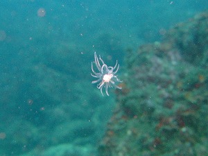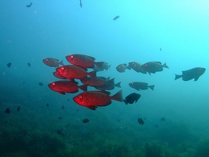 朝一エントリーしたら!!まーーー海はきれいに大変身♪透明度も最高でした。群れも満喫できましたよ。ドカンの近くではカンパチ20匹の群れに遭遇。私たちの周りをグルグルしていました。大迫力です。講習チームも今日が最終日です。海の中ですれ違いましたが、初めてとは思えないほどの中性浮力でしたよ。すごいダイバーに育ってます!!ネジリンボウやウミテング・フリソデエビ・かめのスージを見ながらの講習・・。なんかいいなぁ!!ですよね。それで、本日はこの写真。午後にはこの子が海の中をいっぱい浮遊してるんです。なんじゃこりゃ。至る所に雪が降ってるのかと思うくらいです。きっと・・・イソギンチャクなのかなぁ??と思ってますが・・・なんだろう。魚にいっぱい食われてました。そ・し・てなんか上手に撮れないなぁ・・。赤目防止機能使っちゃう??それにしても川奈では珍しい群れですよね。ホウセキキントキ・・・。体が赤いのね。水温もまだ高いので海の中にいても寒くないです。陸上は風がありますので、防寒着を必ずお持ちください。皆様のお越しをおまちしております。明日も潜るのだ♪