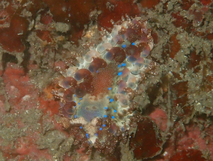 今日は朝から強い日差しが照りつけていたおかげで汗ばむ陽気でしたねー!昨日のうねりは無くなり海も穏やかになりました。気になる透明度も舞い上がっていたゴミや砂などが落ち着いてくれたのでだいぶ良くなってきました。満潮に合せ沖からも良い潮が流れこんできたのがうれしいです。画像はマドレラフェルギノーサという和名がまだ付いていないウミウシです。体色が背景の海草とそっくりで擬態名人なウミウシです。でも所々にブルーのドットがとっても鮮やか!!へんてこな感じですが見た目はすっごく華やかな感じです。水深16m以深では大アジの群れが健在。ぎゅーっと凝縮された群れは皆同じ方向を向き、隊列を崩すことなく優雅に泳ぐ姿は圧巻です。アオリイカの産卵も好調をキープ!週末もこのまま水中生物がみんな元気よく居てくれますように!!