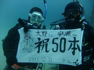 そして、50本記念を迎えられたゲストさんも!来年も、海を楽しんでいってくださいね!棚奥は、またまた群れがすごいことになってますよ!アジ、カマス、ムロアジ、ネンブツダイ・・・ぐっちゃぐちゃ~。水も青いし、サイコーです!浅場やガイドロープ沿いはまだソラスズメダイがたっくさん!!大きなクマノミの横にはちっちゃなクマノミ。ペアになってくれないかなぁ?ツノダシやハタタテダイなどの南の魚はかなり動きが鈍くなってますので、シャッターチャンスですよ!キイロハギもずいぶん長いことがんばっています。