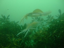 今日は晴れの予報だった気がするのですが、どんよりの曇り空(^^;透明度がちょっと落ちてしまい、暗めの海です。ビーチに七夕の笹の葉が入りましたよ。短冊に願いを込めてみてくださいね!アオリイカは今日も好調でした!朝から4~5ペアが産卵。オスは60~70センチくらいありそうで大迫力です。透明度が悪いせいでアオリイカの警戒心も薄れているのか?かなり近くまで寄れます。1本まるまる見ていても飽きないくらいに、おもしろいですよぉ~。ダンゴ3兄弟も元気、カエルアンコウの幼魚も、ちょびっと探しただけで同じエリアに5個体!ビーチ中さがしたら、一体何個体いるんだろう~?メイチダイやミノカサゴの赤ちゃんも出始めましたよ。