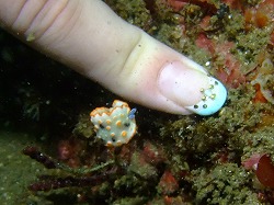 今日はあいにくの雨からのスタート。心配していた風も強まることなく、一日穏やかな海で潜ることができました~。今日のゲストさんたちはウミウシ大好きのウミウシスペシャルのリクエスト!たっくさん見てきましたよ~。ムラサキミノ、サガミリュウグウ、ダンズミノ、フジエラミノ、ゴシキミノ、ミチヨミノ、センヒメ、トウヨウモ、クロボウズ、セスジミノ・・・その他いっぱい!20種近くのウミウシを観察することができました~。ウミウシ、ほんと多いですね♪画像のちびちびハナオトメウミウシ~、爪の大きさと比べると大きさがわかるとおもいますが、小さくってかわいいんですよ!そして、今日また1匹増えて3匹になった梅干しダンゴウオ。ゲストのかなこちゃん曰く・・・「なんてエキセントリックなダンゴさま!!ダンゴ界のレディーガガですね~!!」というわけで、ログブックにもしっかりガガさまダンゴウオの絵が描かれておりました~(笑)他にもちびカエルアンコウやシマヒメヤマノカミなどが観察できてますよ~。今日もにぎやかな海でした!