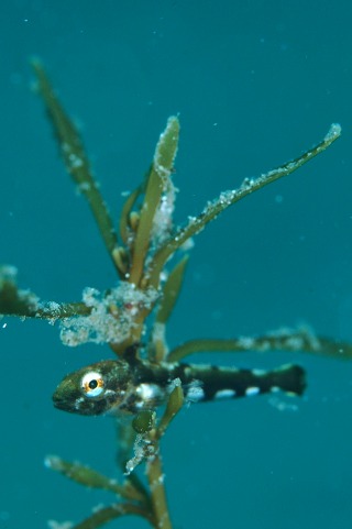 浅場ではエゾイソアイナメや画像のアナハゼの赤ちゃんが海藻に揺られてゆりかごで遊んでいるようです。タツノイトコやマツカサウオの幼魚などもいつもいる場所に居てくれました。砂地がだんだんおもしろくなってきましたねー!!