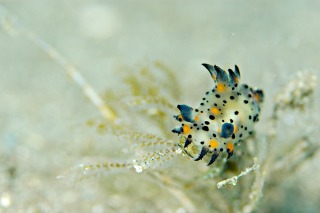 今日は連休初日!はりきってダイビングしてきました~。まずはツノザヤ系のウミウシを求めて、奥の砂地へ。みんなできょろきょろ探していると・・・。コソデウミウシをはっけ~ん!!しかも2個体。水深は19~20mと川奈では深めですが、見る価値ありです。キャベツのテリエビス、ミツボシクロスズメダイ、ガラスハゼ、ビシャモンエビもいます。アブラヤッコ、アケボノチョウチョウウオなどの季節来遊魚も元気にがんばってます。2本目は砂地に出て、生物探し。堤防沿いのテトラにイロカエルアンコウがいた。色はオレンジ。もう大分前からいる個体です。そして今日はブラックの個体も発見。前に出ていたやつだと思いますが、帰ってきてました。相変わらず、見つけにくいです(笑)タツノイトコ、タカクラタツ、ムレハタタテダイなども健在してます。水中ブイの上のハリセンボンもいま~す。割と小さいサイズでかわいいですよ。ぜひ、遊びに来てくださいね。byすぎちゃん