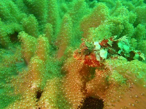 に感動です。水中スレートに「でか!!」って書くぐらいみんなびっくり顔でした。そして新登場のオラウータンクラブ!!またアイドルが増えましたね。ジョーフィッシュもいいし、アジの群れもいいし、ウミウシもいいし!満足のビーチです。ボートでは馬の背にいきました。マツカサウオがとても多く大小とみれます。尾竜に多かったコロダイが馬の背で群れてましたよ。大きなヒラメにも遭遇。うねりも波もほとんどなく快適でした。さぁさぁみなさん、冬眠しててはもったいないです。いつでもお越しをお待ちしております♪