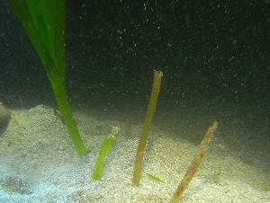 全体的に、キイロに近い海になっています。まぁご想像にお任せします。1本目は砂地へ行ってみました。たこつぼロープから、8~10m先のツノモエビSPまで鬼頭氏がルートをはずすという・・・透明度です。二度目はいけました。(笑)今日は、ミドリのアマモではなく、隣の短いほうにいたので、一瞬いないかとドキドキしましたが健在でした。アマモのほうは、ヒメイカがいっぱいついてましたよ。近所のウミテングもいました。セルフチームさんが、カエルアンコウも近くにいたよ!と教えてくれました。ありがとうございます。ウミヒルモエリアは今、あついですね。今日は砂地に降りてくれるというワザをを見せてくれました。↓