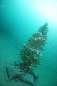 今日も良い天気で、上から見てもダイバーが潜っている場所がわかっちゃうくらいのベタ凪ぎの海です。きのうちょっぴり落ちてしまった透明度も今日はバッチリ回復~。海の色も、だんだんと冬っぽく濃いブルーになってきた気がしますよ~。水中にはクリスマスツリーを設置しました。青い海の中のツリー、ステキですよ!群れは今日も健在ですが、このところまた増えてきたソラスズメダイの群れに混じったキンギョハナダイの赤ちゃんがとってもかわいかったです。メバルが中層でいつもベラにクリーニングされているのがと~っても気持ちよさそう~。1ヶ月前5ミリほどのアオウミウシがい~っぱい出てきましたがとってっも成長がはやくて、1~2センチに成長した子たちがゴロゴロいますよ~。