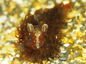 毎度~おなじみ~ちり紙交換・・・ならぬ、伊豆グリーンですよ。今日もがっつりマクロで攻めました。浅場には神出鬼没のタスジミドリガイが岩の上にキレイにのっていて超ラッキーでしたよ。アズキミノやフェルギノーザ、スイートジェリーまで登場!です。暗い海はウミウシが登場しやすいですね。午前に発見された浅場のサギフエは・・・あえなく撃沈・・。深場のサギフエもいっしょに捜索ですね。まぁ・・とにかく見えないんですけど・・・。ヤリイカの卵もすくすく成長!もうすぐ目がわかりそうです。ダンゴウオは赤2個体は健在・・しかし緑ダンゴが行方不明です。えーーーーん。動き回るやんちゃ坊主ですから、またもとの位置に帰ってきてくれることを、または岩にぺったりくっついていることを期待しましょう。