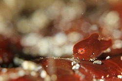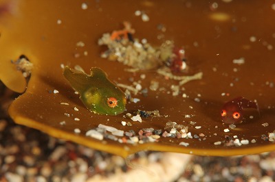 今日は朝から穏やかな海でした。透明度もきのうまでに比べて格段にアップしましたよ!午後は少し濁ってしまいましたが、午前中はいいところで12mくらい見えていました!今日は浅場でガッツリマクロダイビング。リクエストはスナビクニン、ダンゴウオ、カエルアンコウygのみ!(笑)スナビクニンは、黄色の個体が行方不明になってしまいました・・・。ストライプ柄は健在ですよ!ダンゴウオは、相変わらずいるわいるわ。。。だいぶ天使の輪が消えて大きくなってきている個体が目立ちます。早くも岩のエツキイワノカワに定着している個体もいましたよ!ひとつの葉にミドリとアカの子が一緒に乗っているシーンも見られました♪ゲストさんがカエルアンコウygにへばりついて写真を撮っていたら。。。隣にいたコノハガニがいきなりカエルアンコウをはさんで持ちあげるというハプニングがあったそうです(笑)そんなわけで今日も全然時間が足らな~い!充実のダイビングとなりました~。