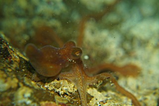砂地の浅場では変なタコとも遭遇しました。ヒメイカみたいに頭の先端が少しとがっていて全体的には超スリムなタコでした。