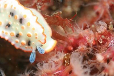 今日もピーカンで暑~い一日。平日も少しずつ港のダイバーさんが増えています。海はべた凪。上から見るとかなり透明度がよさそうなのですが、実際はちょっと白濁しています・・・。水温は、ぐーーんと上昇中。今日の午後は冷たい潮も入っていなかったため、ウエットでかなり快適に潜れましたよ♪岩地の3個体のハナオトメウミウシ、それぞれ離れた位置にいたのに、今日は見事カップルが成立していましたよ!あぶれてしまった(?)もう1個体も近くにきていました。かなり移動したようです。アカエラミノウミウシもまだ見れています。空き缶に住むかわいいニジギンポ、缶の外になかなか出てこないので産卵でもするのかな?砂地にはハナアナゴがポコポコいますよぉ~♪