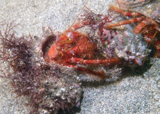 今日も透明度は良くはないです。昨日よりは若干上がった気はしますが(泣)。そんな中、今日はこんな光景が・・・。ヤドカリ同士が殻の奪い合いをしてました。これは僕のなんだから、離してよ(弟)いいじゃん、よこせよ(兄)っとこんな感じで兄弟喧嘩を見ているようでした。どっちが勝ったんでしょうね~(笑)あとは、ハナアナゴ、ハナハゼ、ダテハゼなどを見てきました。もtろん、カエルアンコウもタツノイトコも見ています。