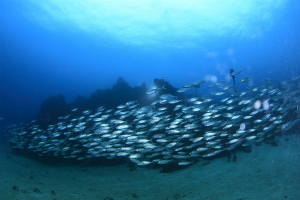 昨日の久しぶりの雨のおかげでインフルエンザ菌もパワーが減少したでしょうか?雨が降っても川の無い川奈は依然、透明度が絶好調です!!画像は月曜日に撮影されたものですが、今日も全く変わらないスコーンと抜けた青い海です。アジの群れが少し小さくなっちゃいましたがそれでもこんくらいの群れになってますので十分ですよね!3本ブイ付近にジョーフィッシュとウミテングとアジの群れがいて中々先に進めない状況です。