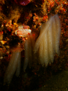 昨日の大雨から一転して今日はとっても良いお天気です。日向にいるとかなりポカポカ。顔と手がちょびっとヒリヒリする・・・・日焼けだぁ。本日ダンゴウオフィーバーの中休みって感じで久しぶりに岩場の奥へ行ってみました。あっ・・・もちろんダンゴウオは元気でしたよー。水深12m以深ではヤリイカの卵が結構多いです。ヤリイカの姿は残念ながら見かけませんでした。オキナワベニハゼのリクエストがありましたのでコンタクトポイントに行って見ると、ちゃーんと居てくれましたぁ!おかげでバッチリ撮影できたようです。その他にはサビハゼの卵・ベニカエルアンコウ・タスジミドリガイ・砂地でスナダコのスーパーベイビー(3cmくらい)めっちゃかわいかったなぁ。クロモウミウシもチャシオグサにいーっぱい卵を産み付けています。春ならでは海!たのしぃですぞー!!