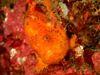いや~、。今日も川奈の海はグリーンだよ。今日は見慣れてきて、見方によっては逆にキレイに感じる?(笑)そんな中、今日も元気にダイビング~。1本目は岩と砂の境で、ヤリイカのタマゴ、ハナオトメウミウシのチビ、スミゾメミノウミウシなどを見てきました。もちろん、きれいなベニカエルアンコウも見てきた!この子は本当に美人さんです。そして今日も1ダイブに3個体のベニカエルを見てきた。相変わらず、ベニ祭り状態の川奈です。