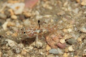 今日もぽかぽか陽気な一日でしたね!海は朝のうちは水面がざわざわ波立っていましたが、問題なく潜れています。泥地のハゼ、カスリやイトヒキ、クサハゼもたくさん出てきていますが、岩地の砂だまりに出てきているのは画像のセホシサンカクハゼやカタボシオオモンハゼ。一見すると、よくいるクツワハゼと変わらない地味さですが、南のほうの魚ですので数は少ないです。これは2センチくらいのベビー、あどけない顔がと~ってもかわいいですよ♪ハゼ好きさん、リクエストしてくださいね!