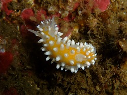 今日は雨が降るかと思いきや・・・お日様ピーカンなときもあったりして、地味に暑い日でした(^^;午前中は、水温なまぬる~い快適なかんじだけれどパッとしない透明度~な海だったのですが、午後はスコーンと抜けて、そのかわりになんじゃこりゃ~?!と目が覚めるような水温の潮が入っていました(^^;う~ん、夏の海ですね~。浅場のガイドロープ沿いは日に日にイシモチやソラスズメダイの数が増えていってます。体験ダイビングでも楽しめそうな海になってきましたよ♪アジ群れもぐっちゃり!ただ、水温のひく~い水底に溜まっていたので、みんな上から確認してオッケ~!みたいなかんじでした(笑)誰一人下に下りず・・・(笑)マクロでは、ハナオトメウミウシ、イガグリウミウシ、ちびテング、ちびカエル、ミチヨミノウミウシなどを見てきましたよ!寒いエリアにはシビレエイもいました。オオアカヒトデには、早くもヒトデヤドリエビが付いていましたよ♪夏に向かってにぎやかになる海に期待です!!