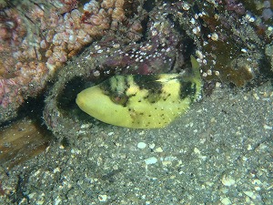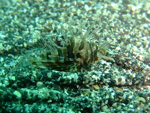 今日もうねりはなく穏やかな海でした~。久々に夏!!ってかんじの汗だくピーカンな陽気♪テンションもあがりますね~。南から流れてきた季節来遊魚も絶好調!コロダイのまだ色が出る前の透明な幼魚、画像のキヘリモンガラにツマジロモンガラ、インドヒメジ、そして今日の大ヒットのキリンミノカサゴの五百円玉サイズ(special thanksかめさん)!かわいすぎです!!