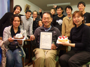 仲間の皆さんが駆けつけてくれて、総勢9名様でのお祝いダイビングになりました~。青い海で賑やかな記念ダイブ、いい思い出になりましたね~!ダイビング後には、みんなでケーキを食べながら岩橋さんご本人から岩橋さんの歴史がクイズ形式で発表されました~。今まで1000本分のダイビング総潜水時間数はなんど5万7293分!すご~~~い!!そして、初めてジェスターに来て下さったのは2000年6月10日!なんと11年も通ってくださってます、ほんとにありがとうございます。そして、川奈で潜った本数は167本!全ポイントの中で2番目に多いそうですよ~。こんな風に、自分のダイビングの歴史を紐解いていくのもとってもおもしろいですね!これからも楽しくダイビング続けてくださいね!画像は仲間の皆さんから岩橋さんへのプレゼント、メッセージ入りタンクです、ステキ♪
