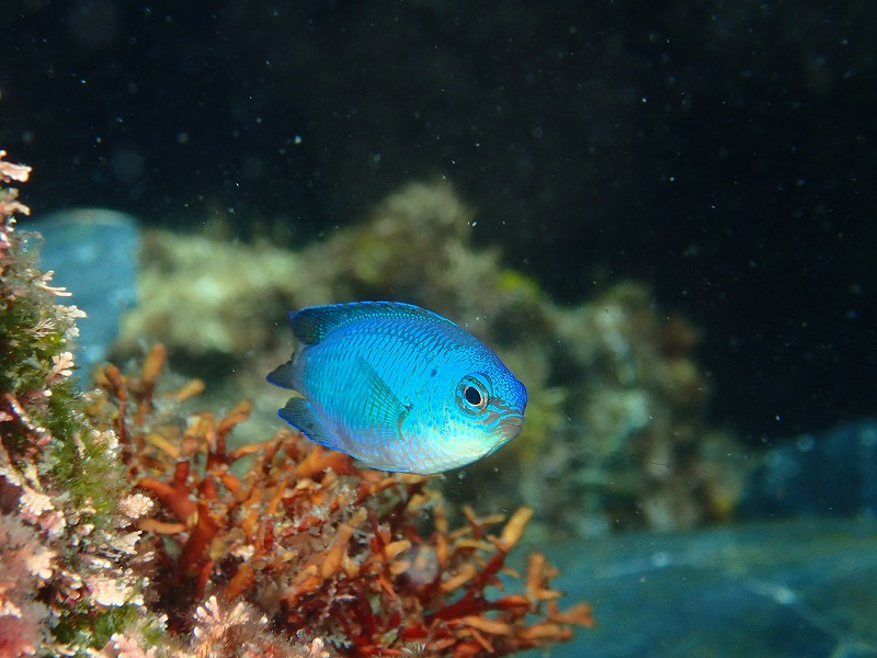 スズメダイの幼魚の中に一匹だけ、オレンジ色のスズメダイがいてビックリした!!!