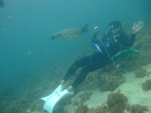 海、キレイです!特に浅場の群れは本当に癒されます。ファンダイブチーム・講習チームにわかれて今日もがっつり潜ってきました。ガイドロープ沿いで2匹のカメちゃんと遭遇!最近は浅場に食べ物を求めてやってきます。これはお徳ですね!ファンダイブチームは入ってすぐでカメと40分遊びました♪ハーフボートでは久しぶりにニホンアワサンゴにご挨拶。もっと大きくなってほしいですね。サクラダイ(メス)の群もいるし、一箇所に固まってるネンブツダイの群も癒されます。岩の上にソラスズメとカゴカキダイのいいですよね♪うんうん♪他にもイガグリウミウシ(まだ交接中)ノコギリヨウジのタマゴ持ちや最近よく見かけるセスジサンカクハゼなど夏モノが出てきてます。是非週末からまたカーーと暑くなりますので是非是非遊びに来てください。最後にカメちゃんに襲われそうな鬼頭氏でお別れでーーす。