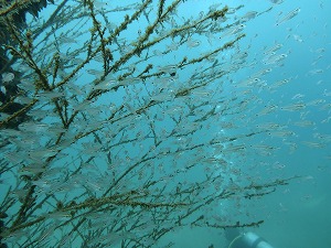 写真はアオリイカの産卵床のネンブツダイの群れ。とてもキレイな群れですのでオススメです。赤根にもいってきました。キビナゴの群れにこちらもワラサがびゅーーん!!すごい勢いでした。透明度もよく流れもほとんどなし!!言うことなしの赤根です♪さぁお盆は始まったばかり・・・・明日は何に会えるかなぁ~楽しみです~15・16日以外はまだ空きがありますので、ぜひ遊びに来てください♪本日奈良からお越しいただいたチームブルーのみなさん、遠いところから初伊豆・初川奈ダイビングありがとうございました、また遊びに来てくださいね。