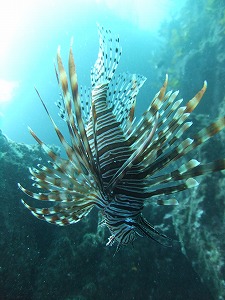 今日も穏やかな晴れでした。海況も安定する季節になりました。毎日、海穏やかですよ~。カミソリウオ、タカクラタツなど被写体豊富なビーチの置くですが、画像のハナミノカサゴも最近よく見かけます。よくいるミノカサゴと非常ににていますが、ミノカサゴよりももっと毒々しいイメージです(笑)季節来遊魚ですが、まだがんばっています。青い海によく映えてとってもキレイですよ~。ソフトコーラルが多いビーチ奥では、背景のキレイな写真が撮れます。カメラ派の方も、浮遊派の方も、ちょっと足を伸ばしてビーチ奥に行ってみませんか~?ハーフボートだと、もっとラクチンです♪