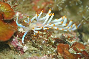 2本目は岩場でオドリカクレエビ・アカホシカクレエビ・ミツイラメリウミウシ・サクラダイの赤ちゃんなどじーっくり撮影です。画像のサキシマミノウミウシも赤ちゃんがいーっぱい見れています。陸上は灼熱の太陽が僕らをヒーヒー言わせてますが、エントリーしたときの気持ちよさは言葉にならないですね。