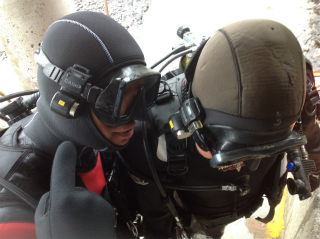わくわくしながら水中へGO!!ノイズが少々ありますが有視界距離分は十分音波が届きます。今日はフードを装着してしまっていたため骨伝導がうまく利用できず・・・・ここちょっとウィークポイントかも。フードの無い状態でしたらいい感じです。細かくはインプレッションのコーナーに記載するのでここではあまりお伝えできませんが、マ行・パ行・バ行の唇を一度つけなければ発音ができないワードをどう克服するかがキーポイントかな?