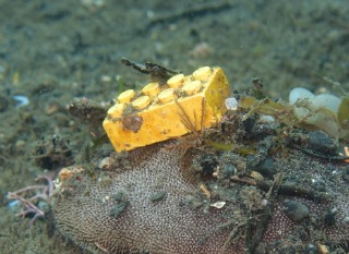 大体はスーパー袋、ルアー、タイヤなど水中にあっても生物になんのメリットもないものばかりですが、たまに写真のような光景も観測できました。空き缶をお家にしているみたい(笑)これを見ると空き缶は水中で役に立つと思ってしまいますけど、やっぱりない方がいいですよね!海辺で遊んだら必ずゴミは持ち帰りましょう。そしてダイバーの皆様、水中でゴミを見つけたら、持ち帰りましょうね!