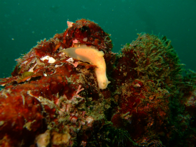 台風が2つも近くにいますね・・・・・今日の川奈はウネリの影響をまったく受けることなくエントリー可能でした。ほんとは本日地元小学校の海中観察と磯の生物の授業があったのですがこんな陽気になってしまったため中止(泣)・・・・・・結構楽しみにしてたのになぁ。定置網で捕獲してもらったサメなんかも併せて見せてあげちゃう特別な授業だったのにほんとに残念です。午後から時間ができたのでロケハンで潜ってきました。画像のキイボキヌハダウミウシは、ガイドのゆきちゃんが発見。まだ、オレンジのドットがうっすらとしか出てない個体でした。明日は台風通過で予定されてたゲストの方も止む無く日程変更です。チビカエルやアオリイカも好調だっただけにこれまた残念。この台風をなんとかみんなしのいでくれよー!!