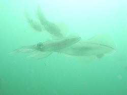 梅雨明け宣言はまだか?と思うほど天気がいいこの頃。今日も暑い暑い、ピーカンです。海もベタベタ~。ビーチ奥では珍しく流れもありましたよ。午後になって満潮に近づくにつれ、ちょっとづつ透明度が上がるの最近のパターンのようです。岩地では、ハナオトメウミウシが3個体、ベニカエルアンコウ、マツカサウオなど見てきました。アオサハギは求愛中~。オスがかなりしつこくメスを追いかけていましたが、メスは相当いやがってるみたいでした(笑)がっついてるアオサハギがかわいくなくて笑えました。そして、今日は大潮ですのでナマコの放精シーンも見られましたよ。しかも、その精子をベラが喜んでパクパク食べていました(^^;久々にアオリイカの産卵もゲストの方が目撃!3~4ペアー来ていたそうですよ♪そんな生態シーンも盛りだくさんな日でした。イサキやネンブツダイ、アジ、イワシの群れ群れパニックも圧巻、これからもっともっと増えると思われます。今日もいい海でした~。