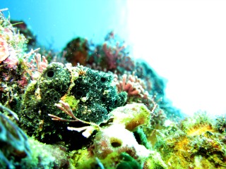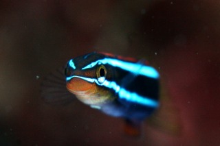 今日は砂地の奥にアカタチを求めて、レッツ捜索!!陸でしっかりブリーフィングをして、隊列まで考えてからのスタートでした。そのポイントまでは生物に一切寄らず、いざ隊列を組んでポイントへ。さぁ、アカタチは見つかるのだろうか・・・。・・・い、いない。なんもいない(泣)空振りに終わりました。帰りがけにイボイソバナガニ、チビオキゴンベ(トサカバージョン)、マツカサウオなどを見てきました。ミナミギンポもいました。青のラインがキレイ過ぎで思わず紹介。写真も正面からバッチリ撮って頂きました。