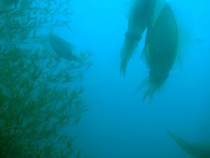 朝からなんだか蒸し暑い日でした。午後には晴れて風もそよそよいい気持ちでしたね。さぁ、木曜日に入れた七夕用の笹にアオリイカが卵を産みに来ています。昨日は午後だったのに今日は午前中に爆裂しました!!15匹以上は確認できています。笹の上のほうで産むので、見上げる感じで写真を撮りました。ちょっとドライスーツの首から海水が浸入する角度です(笑)中層で待つと逃げちゃうので、アオリイカが着たら浮上!!かなりのテクニックが必要な場所です。ぜひみなさんチャレンジしてください。笹とアオリイカ・・あまりみたことがない絵になりますよ。とても神秘的です。ちびのカエルアンコウも健在!今日はクロもいました。ヒイラギの群れの中で気持ちよく漂うのもいいですね。さぁ明日から平日です。貸切アオリイカ是非お待ちしております。