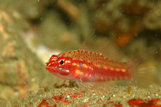 本日天気予報では東寄りの風が結構吹く予報でしたが1日中穏やかでした。少しうねりがあったもののエントリーエキジットには全く問題なしです。透明度が少し落ちてしまいましたが1本目はアオウミガメのスージーちゃんも岩地のウミウシゾーンで、ジボガ・ハナオトメ(いっぱい)イガグリ・ニセイガグリなどをウォッチングしてきました。最近見つけたこの子がとーっても気になります。イソハゼの仲間なんですが赤がめっちゃくちゃ綺麗です。