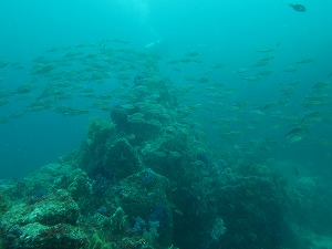 ガイドロープ沿いのソラスズメダイの群れがほんとにキレイですね~夏を感じるエリアです。クマノミやゴマヒレキントキなど南の魚も少しずつ入ってきています。季節来遊魚、どんどん増えてほしいですね~。タツノイトコベビーちゃんもいーっぱい、10匹くらい見ました・・・。ボートでは赤根に行ってきましたよ。こちらも透明度はいいです。15mくらい。イサキは今日も絶好調で振降ってくる降ってくる・・・!