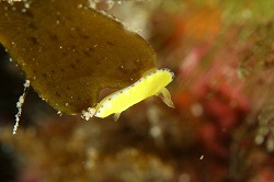 今日はすっきり晴天ですが!平日でほとんどダイバーのいない港です~(^^;透明度もよいですが、すっかり目はマクロ!ウミウシウォッチングが楽しくなってくる季節です!浅場にはツマグロモやアリモウミウシなどがどんどん出ていますし、ルージュやセスジなどのミノ系も岩地に多くなっています。2週間くらい土管の上に乗ったままの大きなミヤコウミウシや、もちろんカンナはじめツノザヤ系のおまつりも開催中!画像は棚奥で先日見たウミウシです。ゲストさんに撮っていただきました。いろいろ調べてみているのですが、いまだに何ウミウシなのか不明です。。。ミツイラメリではなさそうなんだけどな!大きさは1センチくらい!う~ん、ちいさ~い!ウミウシ好きな方、一緒にウミウシダイビングしませんか♪