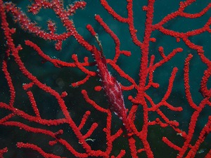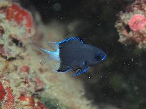 大きなカンパチもまわってますよ!このところ毎日クエの子供のモロコも見れています。ゆりえマイブームは貝類!アヤメケボリ、コボレバケボリ、アズマケボリ、そして画像のベニキヌツツミガイはよくいる貝ですが、ホストのヤギがと~ってもキレイなので気に入っています。写真にとると鮮やかな真っ赤色なんです♪その近辺ではセスジミノ、ミチヨミノ、コロダイ幼魚、ミナミギンポ・・・いろんなものが見れますよ!そして、こちらも最近お気に入りのシコクスズメダイの幼魚は強い光を当てるとひれのふちと口がメタリックブルーに光るんです、と~ってもキレイですよ!ボートでは今日も尾竜に行ってきましたが、オオモンカエルアンコウ祭りはまだまだ開催中~♪こんなにたくさん見られることは珍しいですよ!ボートのリクエストお待ちしてます~。ボート、他のポイントもアツイですよ♪