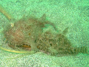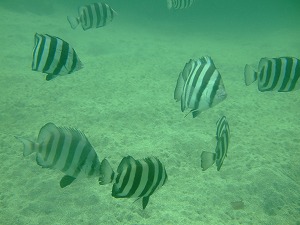今日はうねりも全くなくなって、フラットな海。天気もよくダイビング日和、水温も生ぬる~いです!浅場は水が濁っていて透明度が5mほど・・・(^^;でも砂地に出ると10mくらい、ちょっと沖へ行くとだいぶ抜けて12mくらい!