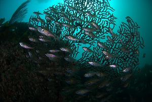 今日の海は時折大きなうねりが入り波の合間を見てなんとかエントリーエキジット。午後2本目が終る頃にはかなりうねりが大きくなってしまいました。水中もかなりうねりはありました。岩地の奥まで行くと魚がぎゅっとかたまっていてかなり見ごたえがあります。大きなウチワにネンブツダイがからんでとってもキレイ!