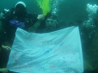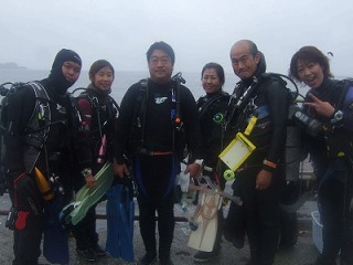 あいにくの雨ですが、台風の影響はまだ出ていません!穏やかな海でした。エントリー口には赤潮が溜まっていますが、表面だけなので、透明度は結構いいですよ♪今日は、いつも大勢で来て下さるチームオクトパス100本記念ダイビングでした!本多さん、おめでとうございま~す♪アオリイカを呼ぶ祈りのダンス、サイコーでした!無茶振りにステキなアドリブ、お見事です(笑)皆さんほんとに楽しそうで、一緒に潜っている私たちまで楽しくなってしまいます。アジ玉、すごいです~そして今日はウミタナゴの群れもすごかったぁ~。顔の大きさくらいあるんじゃない?!ってくらいのミヤコウミウシもいたり、ちびカエルアンコウを探すのに苦労したり、ダンゴウオをじ~くり見てみたり・・・充実したダイビングでした~。明日はタキさんが100本記念!楽しみですね~♪