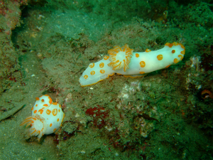 風がまだ強く吹く予報だったので、海況を心配しながらのスタートでしたが、台風あけ、や~っと潜ることができました~!北東の風による波・うねりはあったものの、入るとびっくり透明度も10mくらいあります。魚も増えていて、テンションあがりますね~!カエルアンコウのペアやベニカエルアンコウ、ハナオトメウミウシもいっぱい、びーちには珍しいサメジマオトメウミウシ、キイボキヌハダウミウシもいましたよ。